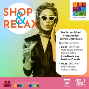 Shop & Relax lädt Euch ein: Zum Start in den Feierabend mit entspanntem Shoppen bei Live-Musik, Drinks & Snacks.